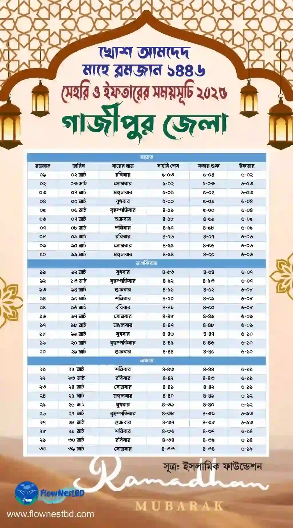 গাজীপুর জেলার সেহরি ও ইফতারের সময়সূচি ২০২৫ এবং ১৪৪৬ হিজরির রমজান মাসের ক্যালেন্ডার
